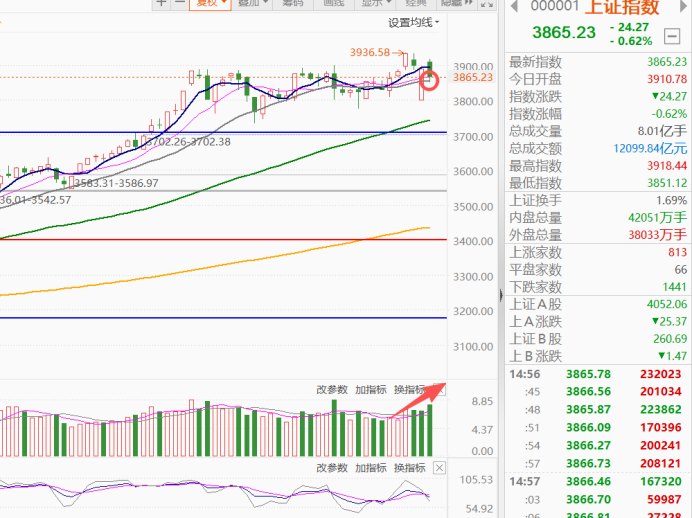 三大指数冲高回落,分化明显。 上证指数来看,今天有权重的护盘,走的不是很强,但是还是稳到了大阳线的内部和20日均线上方,但是出现了放量下跌的走势,高位也在4000点位置附近横盘。 小沐年初的时候,就已经明确了观点的,大盘看3600点到4000点,现在已经到了!观点得到了验证!