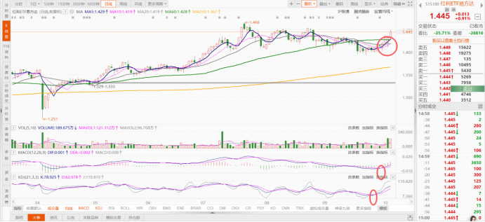 红利 一、技术面:多头趋势稳稳当当 先看 K 线图,红利 ETF 易方达( $红利ETF易方达(SH515180)$ ) 的均线系统堪称 “教科书级多头排列”:5日10日均线拐头向上,20日均线形成强支撑。今天直接收复并且站稳了60日均线,典型的止跌企稳信号!KDJ 指标底部金叉后动能十足,说明短期多头力量完全主导。成交量方面,近期维持在均量线上方,资金进场痕迹明明白白,MNCD指标底部也出现了金叉!这波趋势的持续性不用愁。