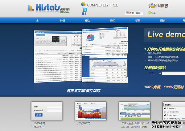 4. histats https://www.histats.com/ histats是一款国外老牌的免费网站统计工具,相比百度统计肯定是没有强大,但是功能全部免费,而且只需邮箱登录即可使用。 网站计数器的样式非常丰富,有近百种统计表样式,支持动态显示在线人数,还有纯图片统计代码,每天可统计最多1000万次点击,完全够用。 优点:功能强大,部分可以选择中文显示,国内使用方便。注册也非常简单。 缺点:毕竟是国内的代码统计,使用到国内网站上偶尔会少统计一点点。